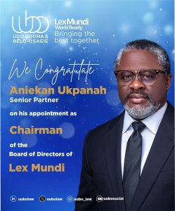 Against this backdrop, I read an announcement recently from Udo Udoma & Belo-Osagie (UUBO), a leading Nigerian law firm, that brought immense pride to my heart. My dear friend and brother, Aniekan Ukpanah, has been appointed Chairman of the Board of Directors of Lex Mundi, the world’s oldest and leading global network of independent law firms. The announcement stated: